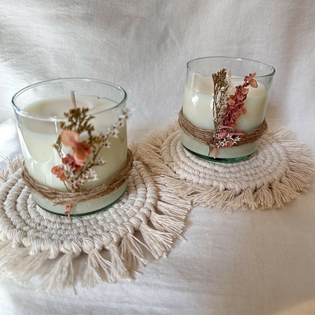 contiene: 2 velas de soja en frasco de vidrio recto x 200 cc decoradas con yute y flores secas + 2 apoya velas de macramé. Ideal para crear un ambiente acogedor o como un regalo especial.